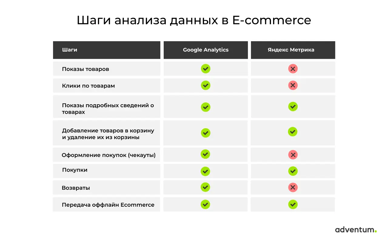 При работе с Ecommerce в Яндекс.Метрике возникают определенные ограничения, которые затрудняют анализ данных. Например, система не может обработать все пуши, связанные с оформлением покупки, что затрудняет анализ корзины товаров и форм оформления заказа. Шаги представлены в таблице: