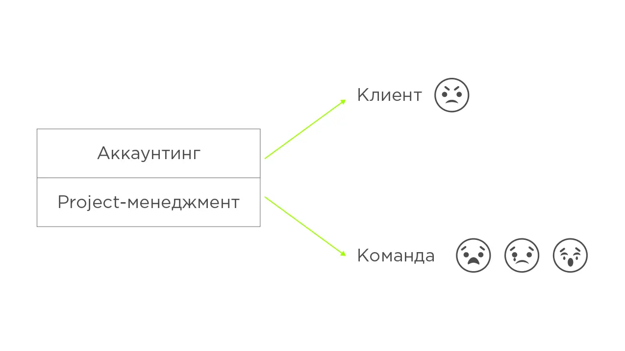 Аккаунтинг и project-менеджмент – это две стороны одной медали, поэтому я их отношу к единой плоскости. Аккаунтинг, т.е. ведение клиентов, – это сторона, обращенная наверх, на клиента. Project-менеджмент – сторона, которая обращена вниз, на вашу команду специалистов. При этом это некие взаимообратные ступени эволюции: грамотный project -менеджмент – это следующий этап после грамотного аккаунтинга, и наоборот.