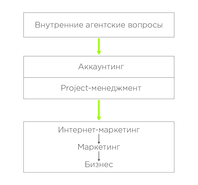Таким образом, аккаунт распределяет задачи, project управляет задачами, а интернет-маркетолог принимает бизнес-задачи клиента и раскладывает их на интернет-маркетинговые. Аккаунта просят подобрать семантическое ядро, написать объявления и выставить настройки РК. Project-менеджера – запустить performance-каналы. Интернет-маркетолога просят поднять продажи с digital в N раз.