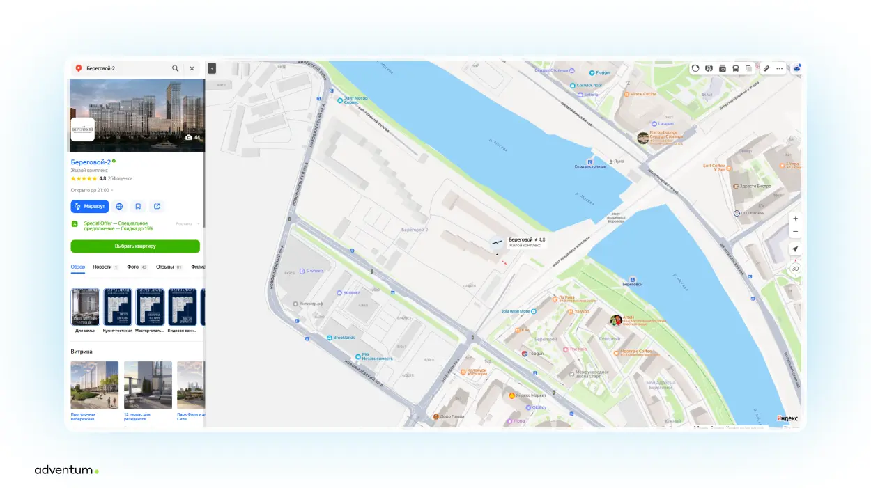 Преимущество такого формата в том, что он позволяет закрепить ассоциацию точки с конкретной локацией — то есть человек запоминает, в какой части города и где на карте находится бренд. Это важно для застройщика, ведь место играет одну из ключевых ролей при покупке квартиры, особенно в премиальном комплексе. Особенно, когда вид — на Москву-реку. Более того, по статистике Яндекса, первые 10 позиций в списке при поиске получают 86% кликов, а размещение POI увеличивает шанс попадания в данный топ. Следовательно, при брендированном размещении с POI пользователи намного чаще видят организацию, ее акции и предложения.